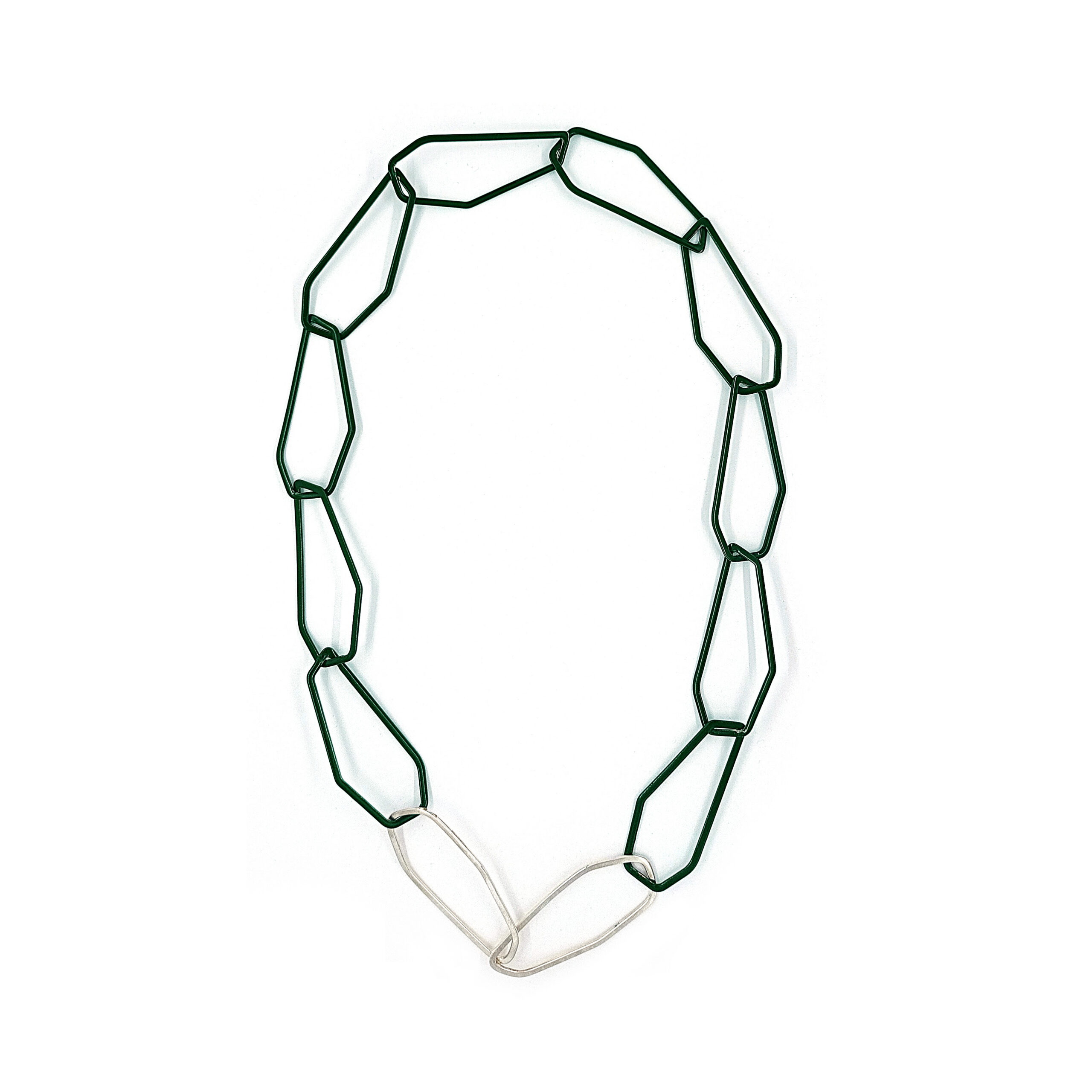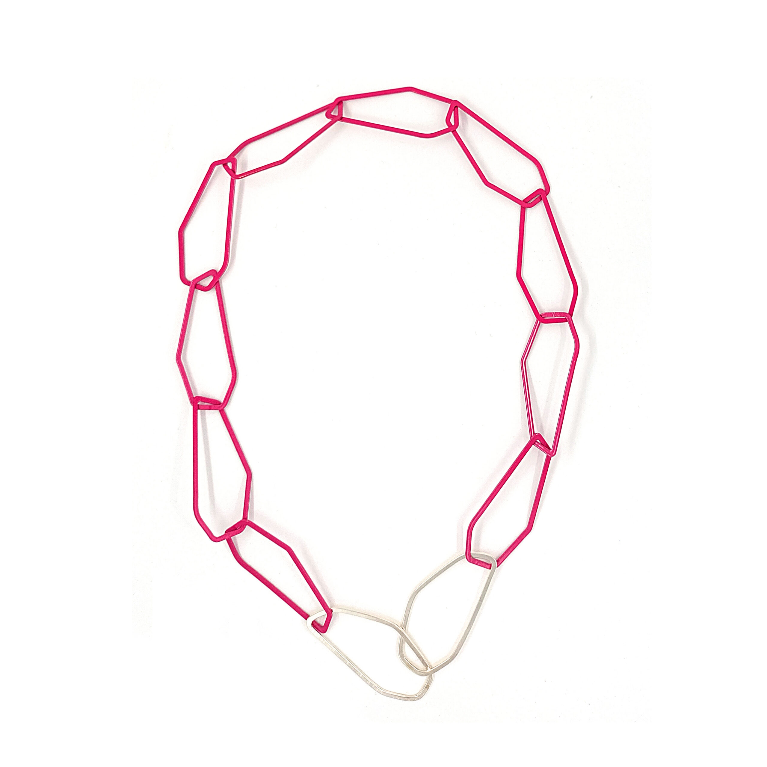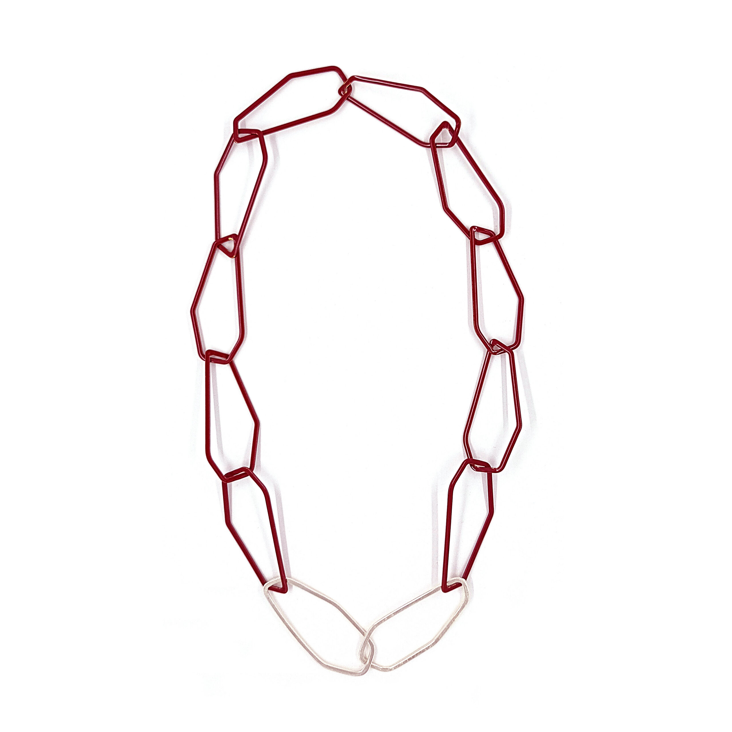 The open frame elements create a rhythm around the neck. Light yet striking, minimal yet full of character. Each link feels like a drawn line in space, forming a wearable composition that shifts subtly with movement.