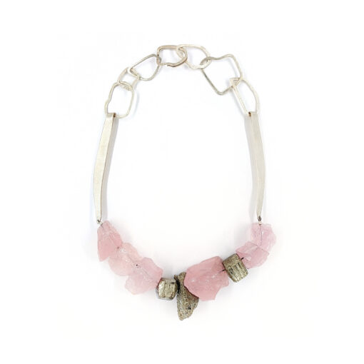 Slim silver elements meet raw, unpolished stones, each with its own shape, surface and story. The composition feels intentionally unperfect: calm lines holding space for organic forms. A quiet tension emerges between control and freedom, order and discovery.