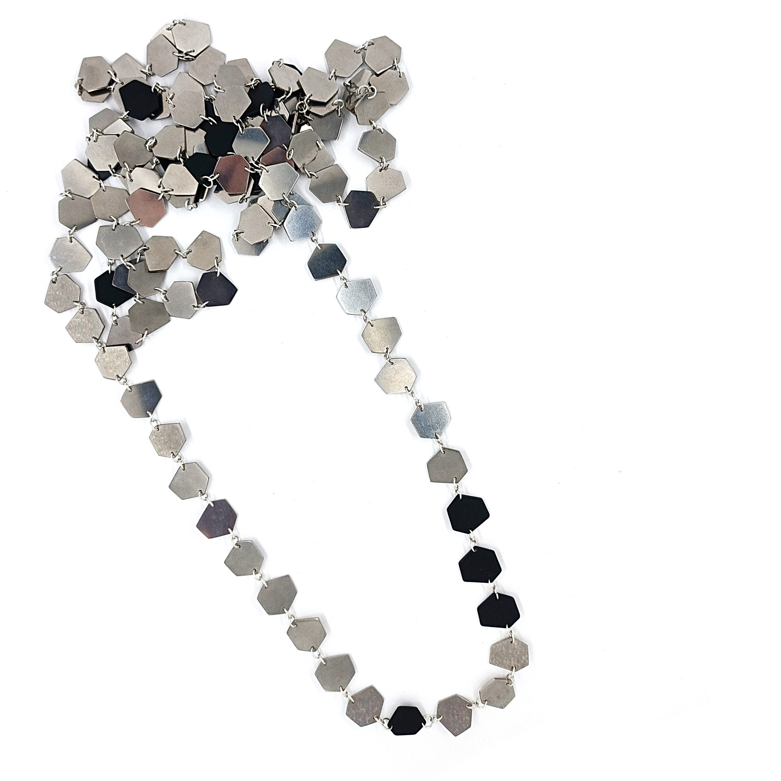 The Mini necklace is part of the Unique Art Pieces collection, created as a one-of-a-kind exploration of rhythm, movement, and transformation. Inspired by my earlier Mini series, this piece plays with repetition and variation, turning the Mini elements into a flowing, living structure.